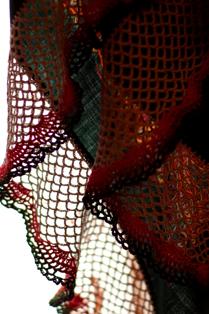 А о том, что пролежала шаль у меня пару дней со вновь созданной бахромой на 1/6 части платка и когда я решила продолжить, то обнаружила - бахрома-то распустилась, т.е. узелки настолько ослабли, что бахромки уже не вниз направлены, а все на изнаночной стороне оказались. и смотрят в разные стороны.