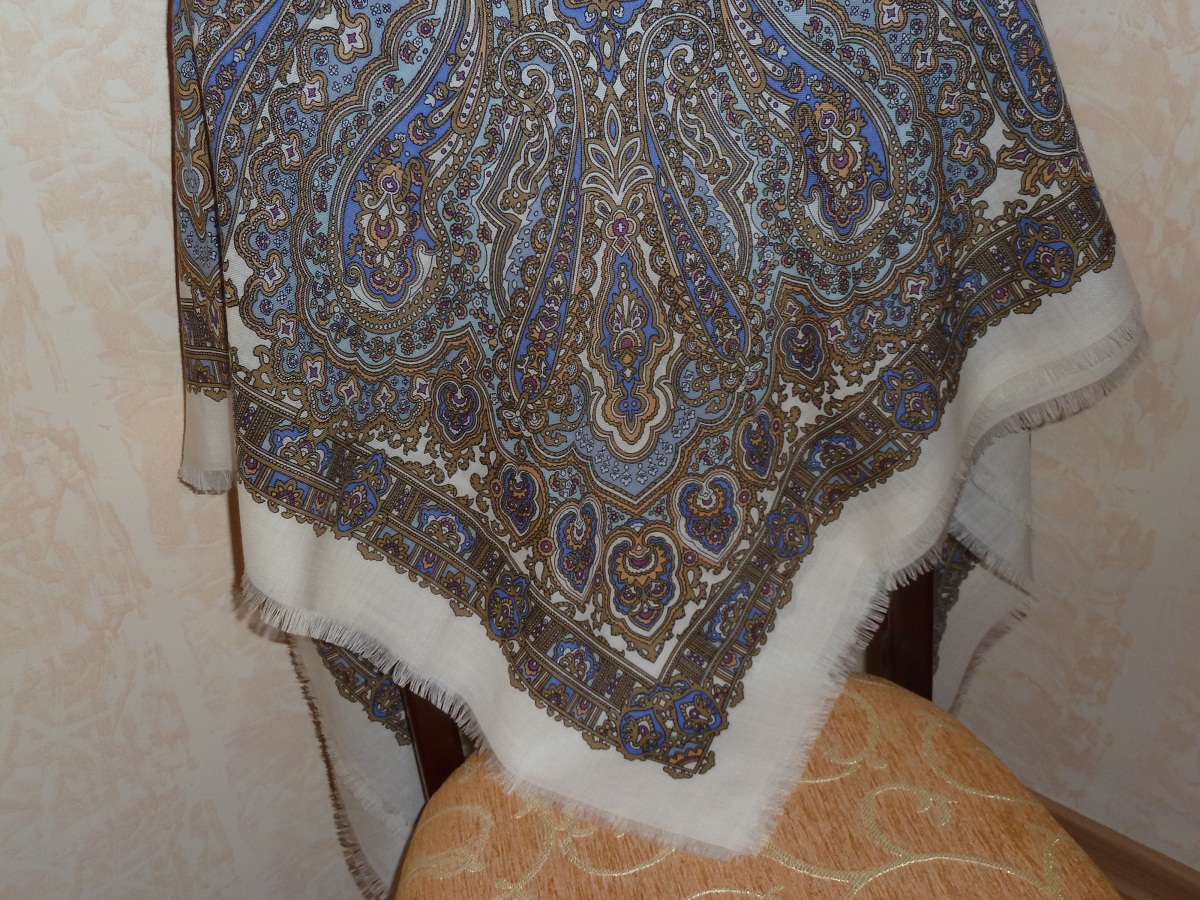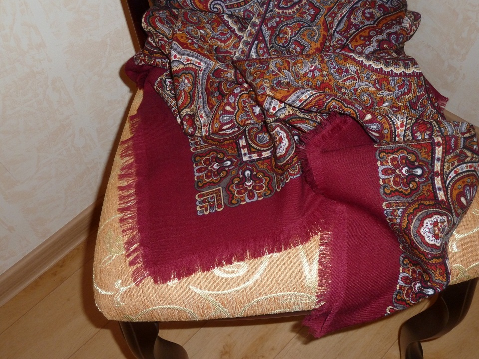 Где-то уже писала, что хотела купить Ситцевый край с красной каймой, а случился с темно-бордовой. Не нравился с такой. Я отрезала кайму вообще. Подшила руликом вручную(машинка была вне зоны доступа)-получилась этакая шерстяная косынка- павловопосадскости-ноль, но ничего страшного. Единственно-слишком серый фон этого платочка, люблю посветлее, цвета сливок.
