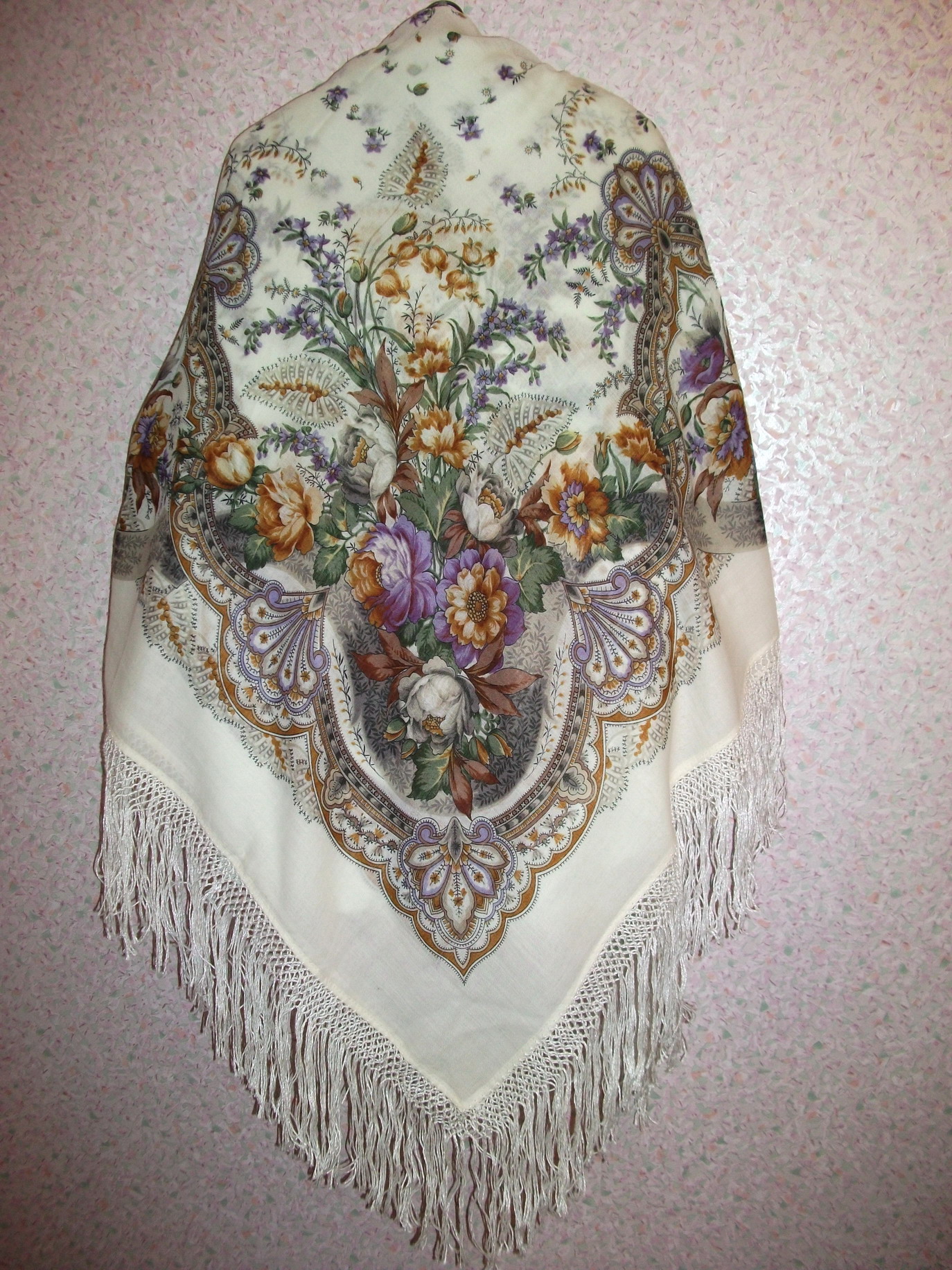 Yuly1104. Мне очень понравилос. Очень аккуратно. Всё же, на мой взгляд, платки с бахромой намного богаче. Что Вы сделали с краем у долины цветов? Подогнули и пристрочили? Или так бахрому привязывали? (собираюсь его обахромить, вот размышляю, не сильно ли уменьшится кайма, если подогнуть)