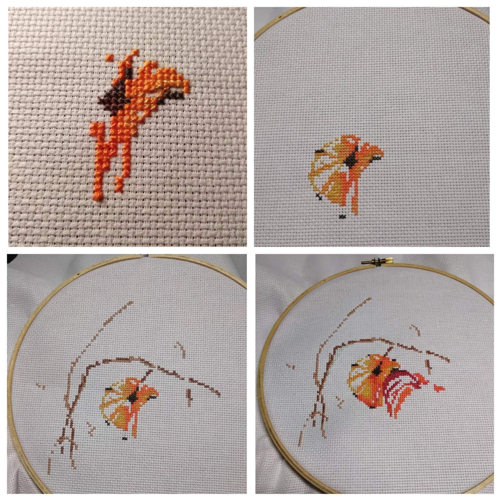 В процессе работы это может не очень эстетично выглядеть--обрезанные хвостики, зато нити закрепляются прочно, особенно при частой смене цвета. По мере продвижения работы, все лишнее срезается и подчищается. У меня как правило, в работе сразу вся палитра, поэтому бывает в "процессе"--"темный лес". Можно для начала ограничится 2 -3 цветами.