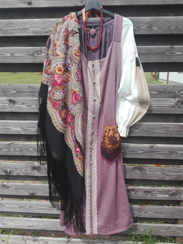 Восхищаюсь вашим мастерством, доведённым до совершенства! Отличный комплект: сарафан+рубашка+шаль! Ещё сумочка (лакомка?) с бусиками. Не удивляюсь, что хозяйка носит комплект постоянно. В нём, видимо, очень комфортно и приятно.