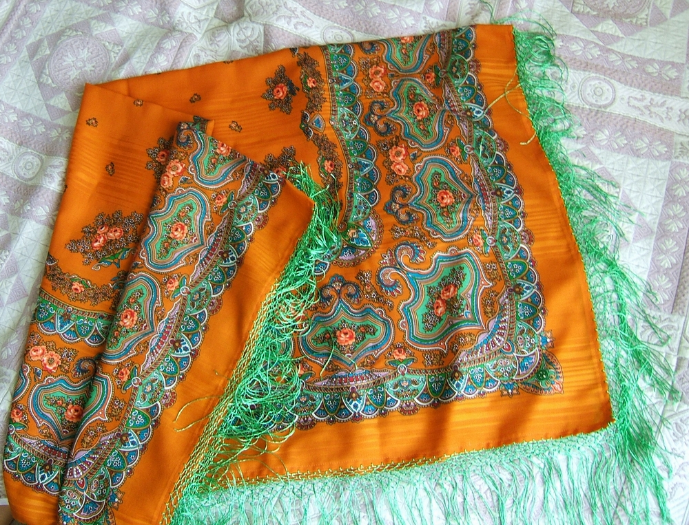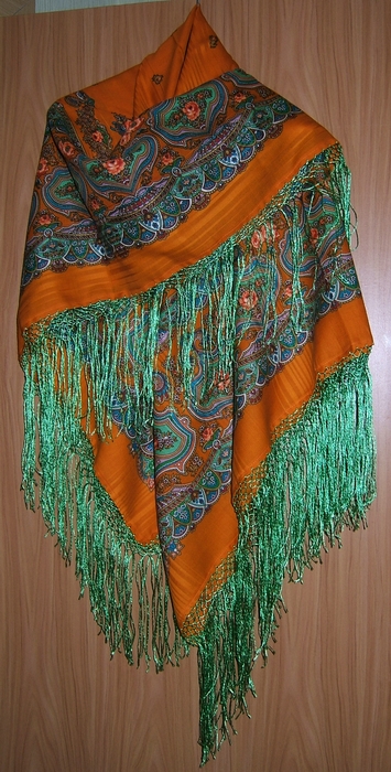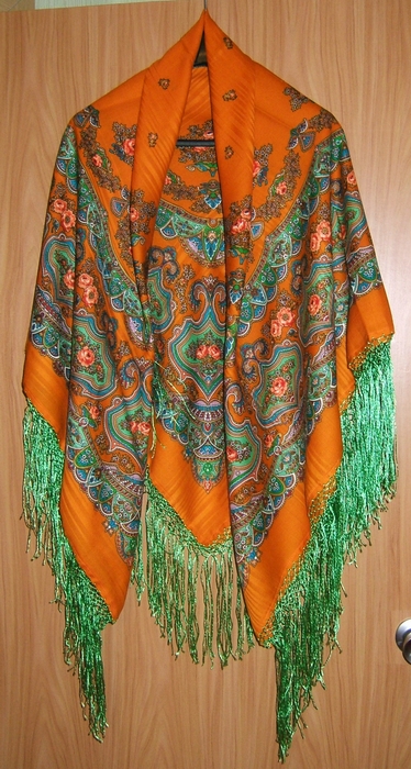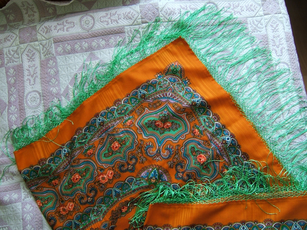 Решила обахромить. Искала по всей Москве идентичный оранжевый. Сколько я с этим платком пробежала по магазинам))) "И ни сащщщитаишь!".. в итоге в фирменном магазине Семновской фабрики мое терпение лопнуло и я куила ярко-зеленый.