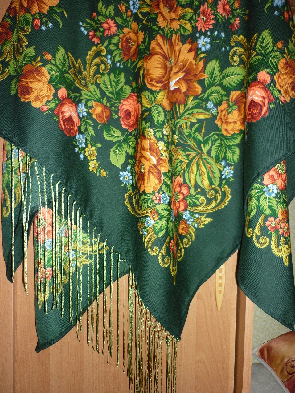 А про ансамбль, это Вы в точку попали, есть у меня кусок ткани, даже не помню, что за состав, полиэстер, наверное, (очень давно лежит) но цвет один в один к макам и бахроме, может быть дойдут руки юбку сшить, вчера весь вечер думала, что бы ещё в комплект к платку приспособить.