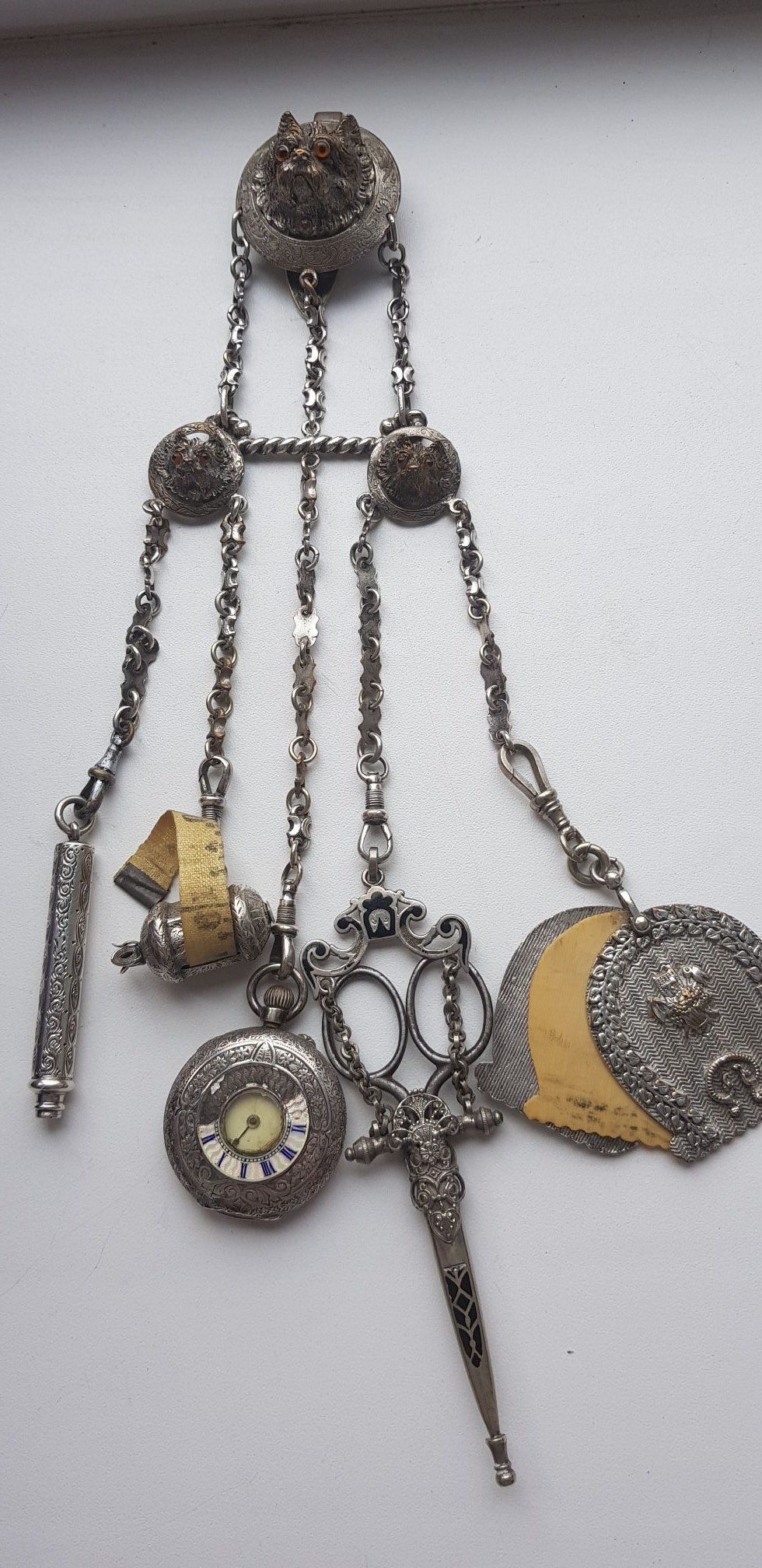 Какая чудесная штучка. Про шатлены читала не раз, как-бы сейчас пригодились. В современных реалиях на связке ключей ношу небольшую рулетку, при любви к ремонтам и строительным магазинам, вещь первой необходимости :)