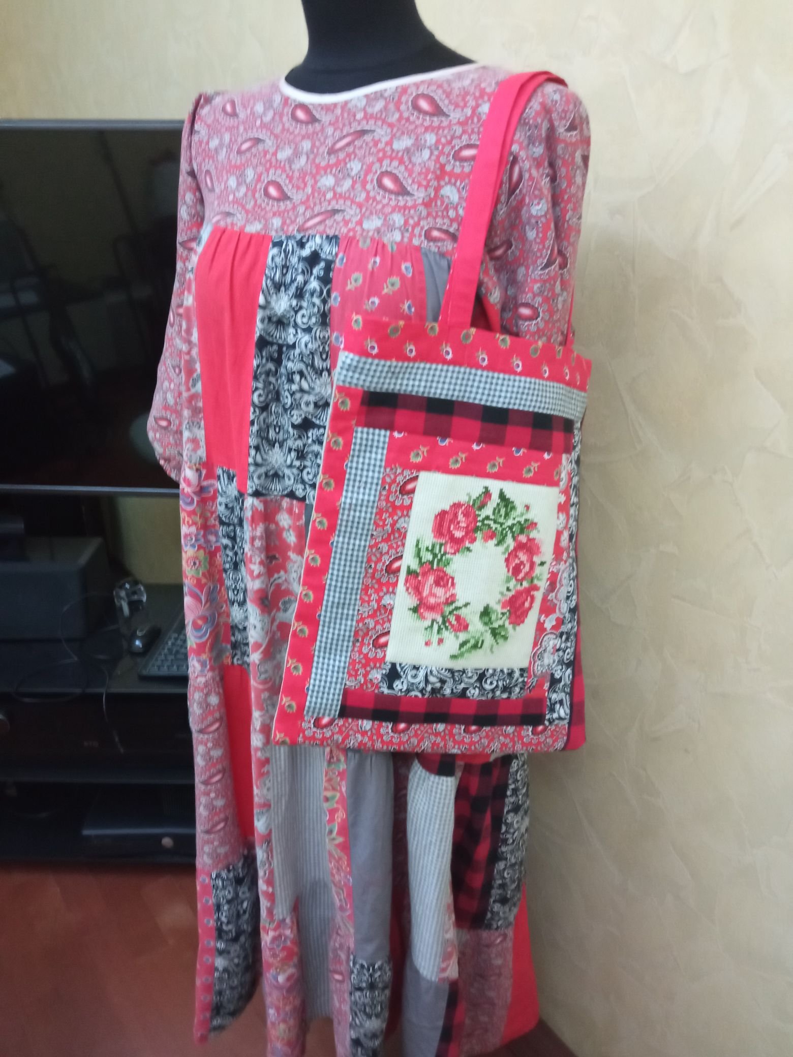 Внезапно сшился лоскутный шопер. С вышивкой по центру. По мотивам прошлогоднего платья.