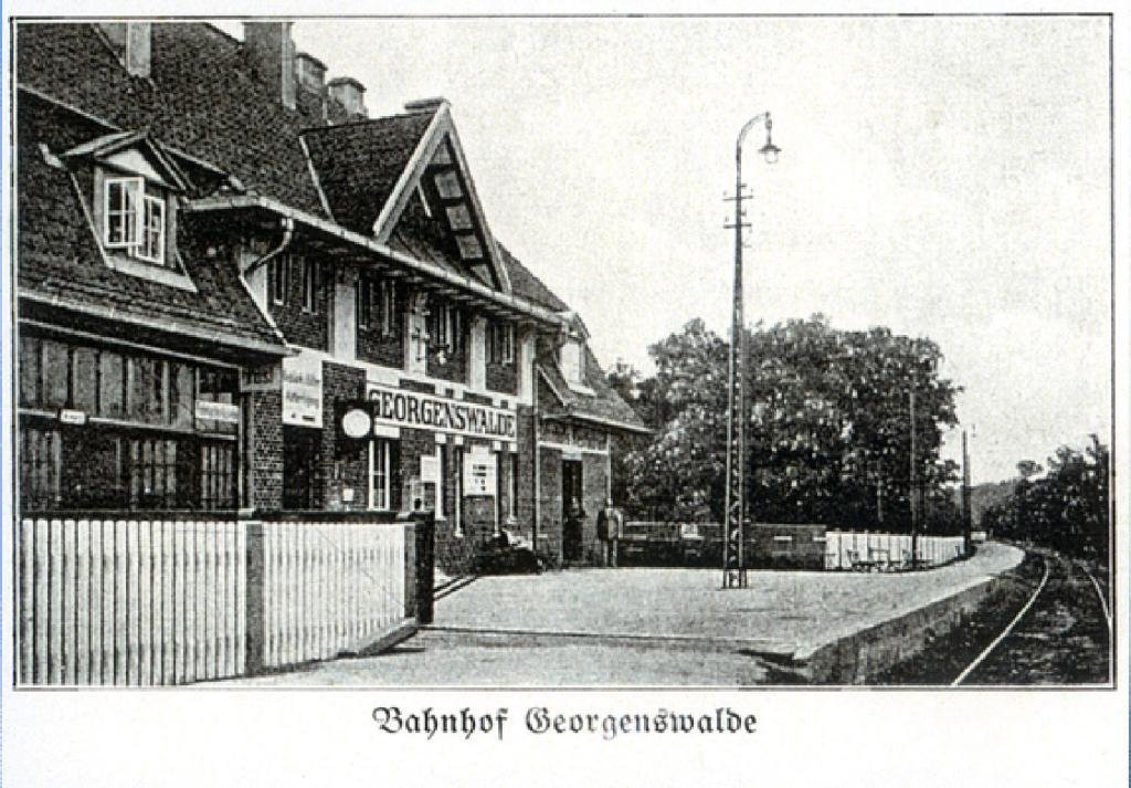 Железнодорожный вокзал построен в Георгенсвальде в 1912-1913 годах по проекту кёнигсбергского архитектора Макса Шёнвальда в стиле, который польские исследователи называют живописным историзмом, немецкие ученые обозначают термином "архитектура реформ".
