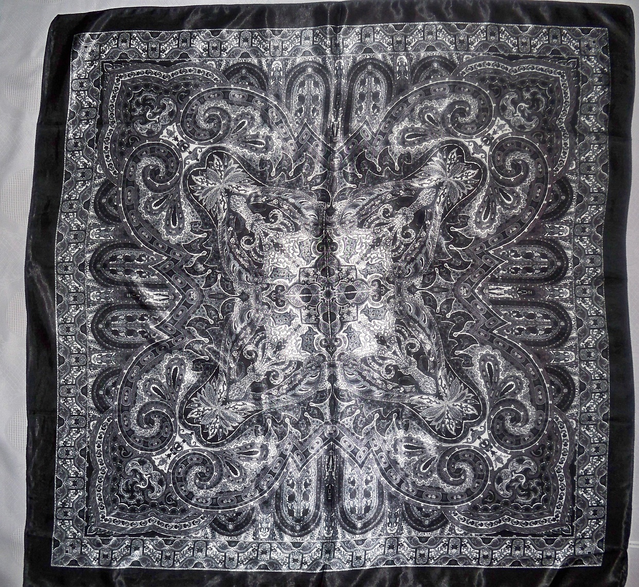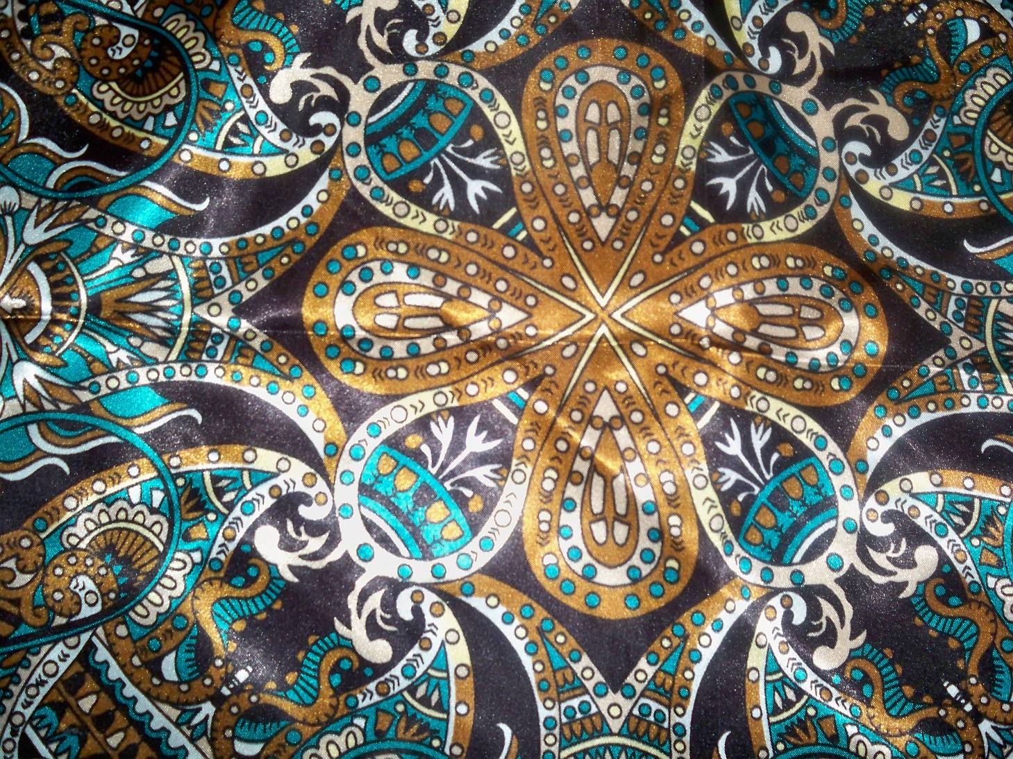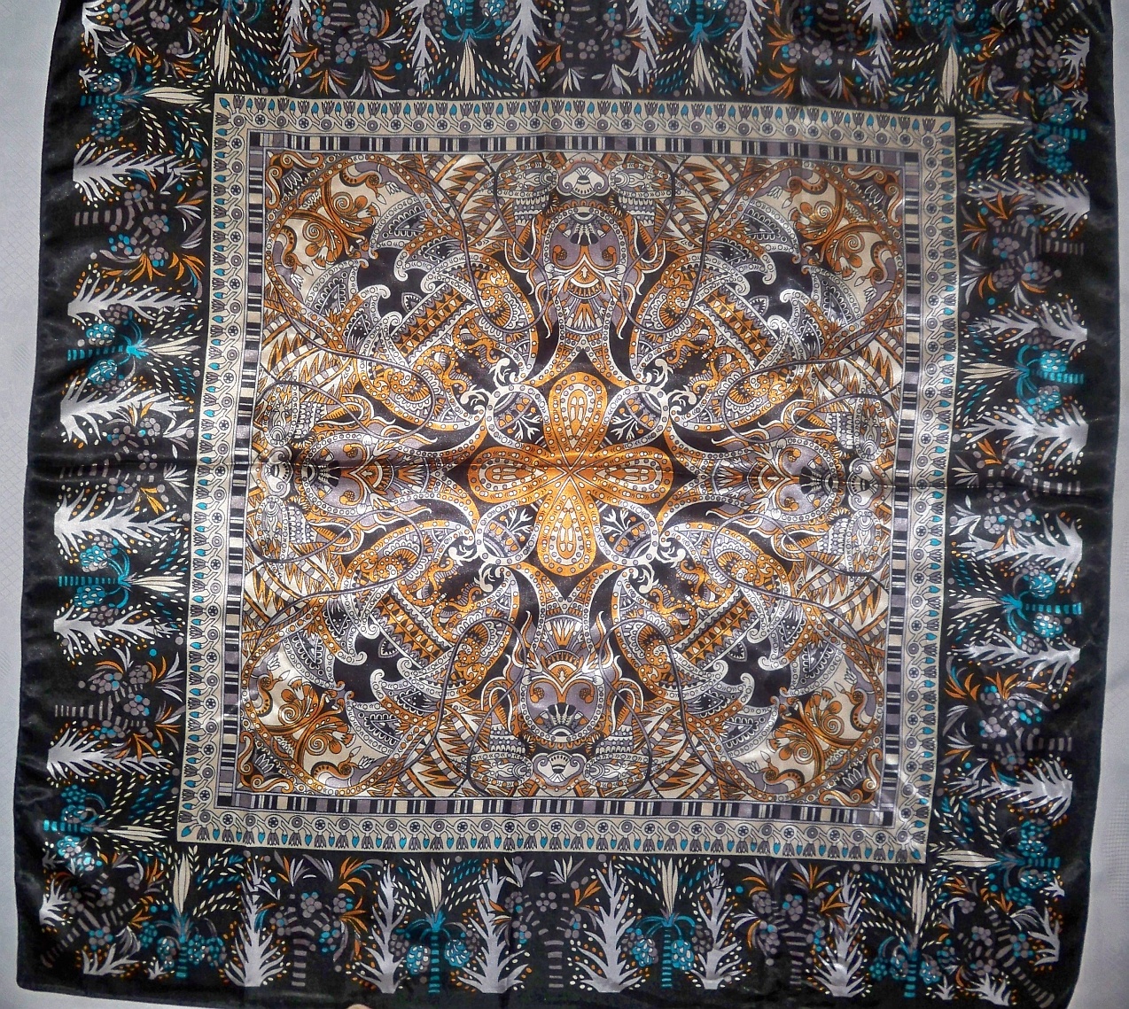На одном из вещевых рынков нашего города нашла, а потом и купила три атласных платочка из полиэстера, размер 89х89. Рисунок 846-Новелла, в чёрно-серо-белом исполнении. Золото Исиды-два колорита. На вопрос: откуда платочки?, продавец ответила, что из Москвы. Цена одного платка 200 рублей. Этикеток не было, только пришит ярлык с названием материала и знаками по уходу за изделием.