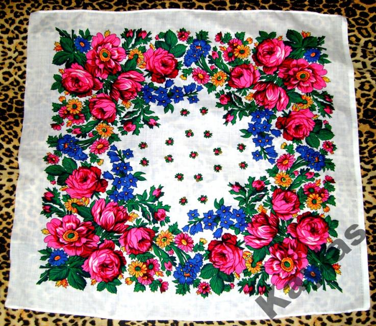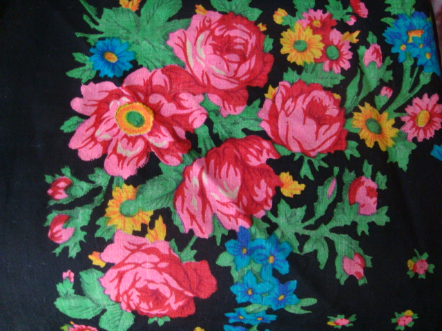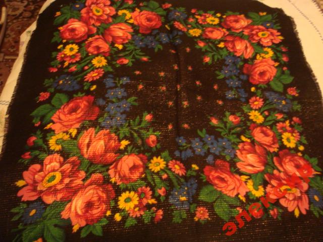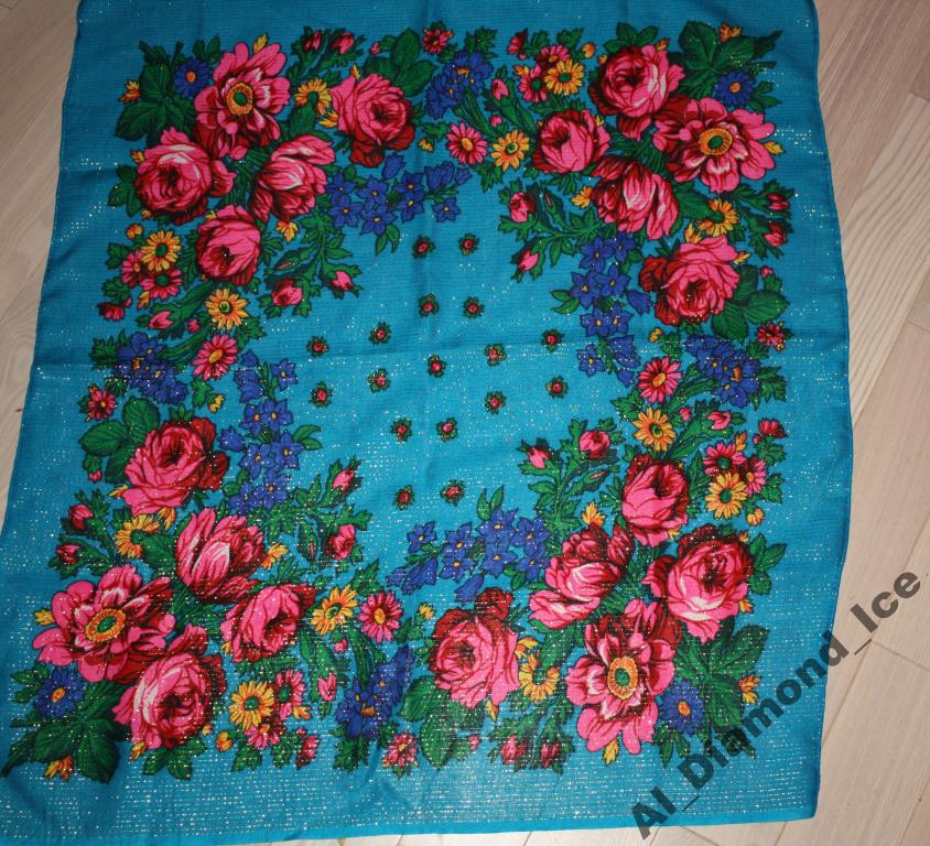 Однако встречается он не в павловопосадском исполнении, а в японском - на шерсти или будто-японском - на синтетике. Размеры разные, все существенно меньше 90х90. Рисунок претерпел некоторые изменения: стал контрастнее, жестче. К тому же, его перерисовали в зеркальном отражении.