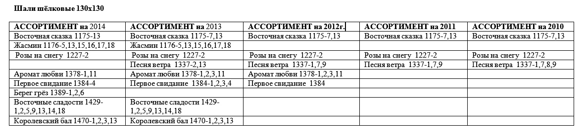 Ассортиментные программы по шелковым шалям 2014, 2013, 2012, 2011, 2010 года.