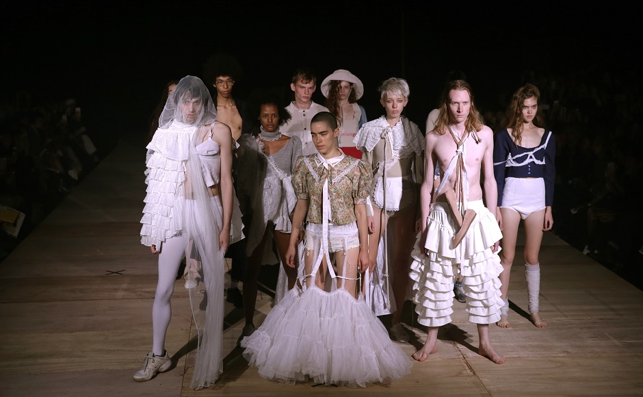 Привлекли. Вижу эклектичность, небрежность, такой "антиромантизм" в сочетаниях кружева и шитья с небрежным, непродуманным "низом"(Кликните, чтобы почитать оффтопик)..., пастельные тона и много белого цвета, отсутствие "гламурных" деталей и высоких каблуков, оборки-оборки, даже на брюках, подтяжки и странные лифы. Новое (для меня)- активное использование в показе трикотажа в рубчик цвета небеленого полотна по типу нижнего солдатского белья? Возможно, новый тренд. И шелковые блузы ультра спортивного кроя.