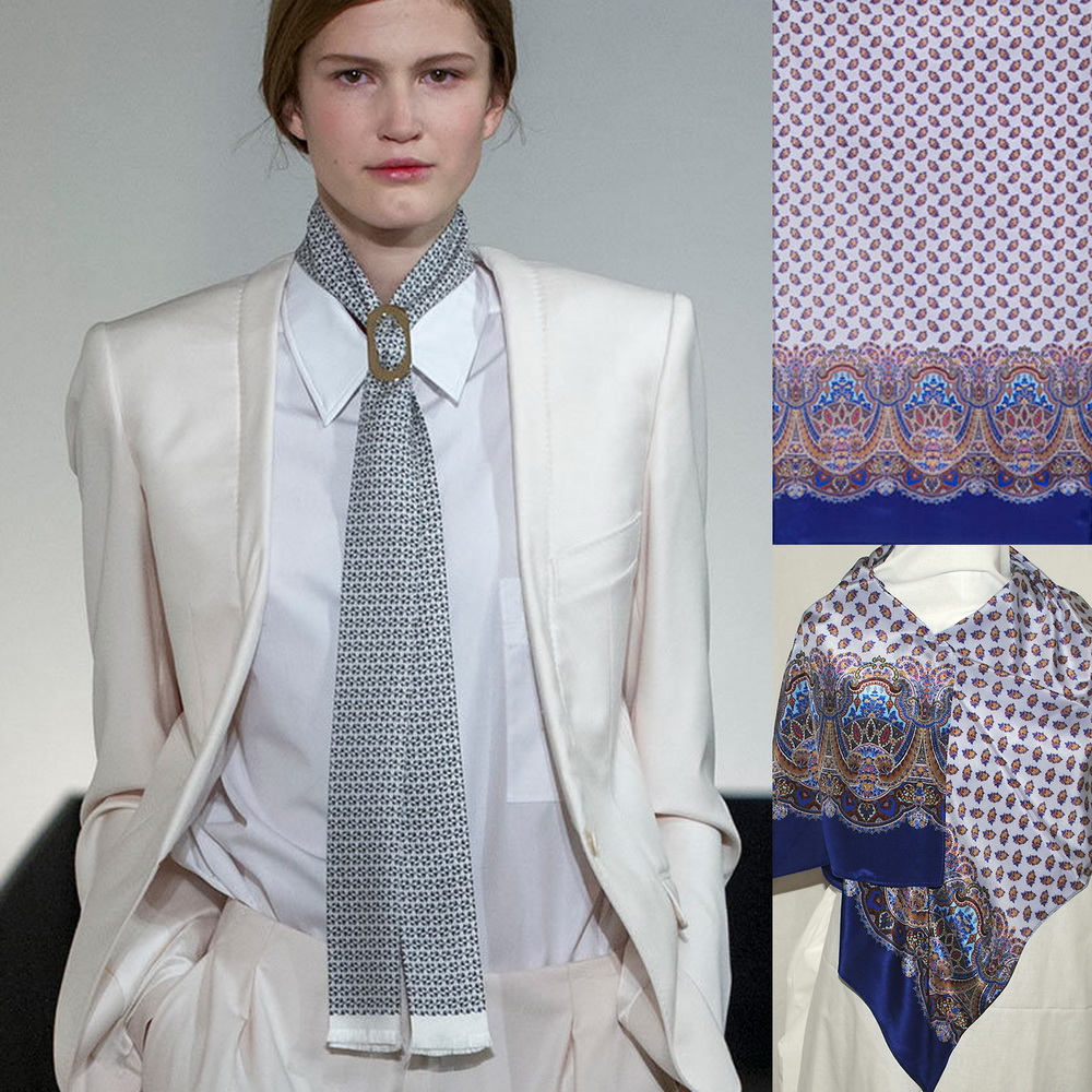 А я тут болею и "бороздю" просторы интернета. Разглядывала коллекцию весна-лето Hermes и обратила внимание на шарфики затянутые в симпатичную пряжечку и нафантазировала, что можно было бы, в соответствии с тенденциями, и шелковый шарфик "Маркиза" приспособить. Фото с шарфиком одно взято с сайта ППМ, другое у конкурентов