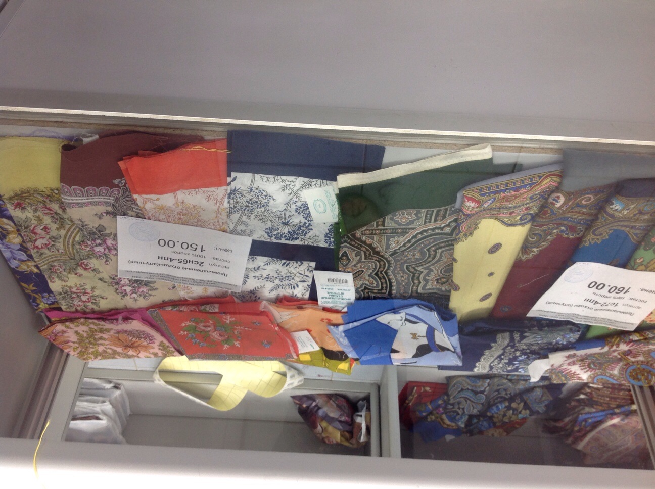 Здесь мерный лоскут платков разного размера.