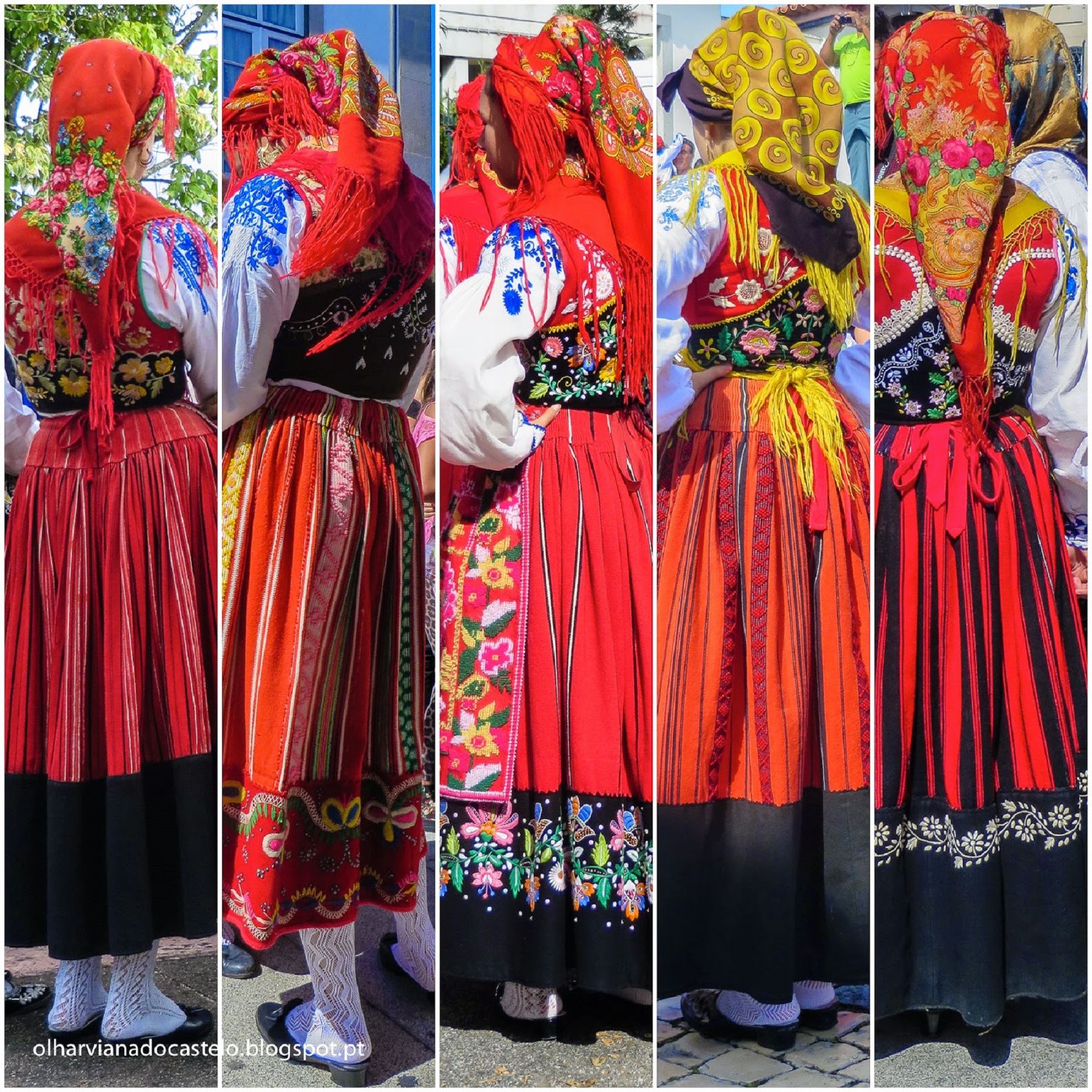 В материале о костюме Vianesa - коллаж из 5 фото и пояснение: «Очень известный костюм, который вот уже более 100 лет носят девушки из деревень округа Виана-ду-Каштелу. Этот красочный и столь типичный костюм – традиционный символ региона.»