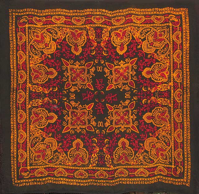 Никогда не интересовалась тем, какие разновидности батика существуют, что такое есть батик. Не было надобности. Поэтому в голове сидит представление, что батик - это роспись по ткани. Допускаю, что к батику следует относить и какие-то еще способы нанесения краски на ткань, о которых я не знаю. Так вот, мне показалось, что тут краска нанесена при помощи шаблонов. Можно это считать батиком или нет, не знаю. Хотя и набойку я бы не стала исключать. А роспись - да, едва ли.