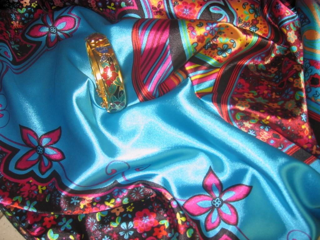 marinella, очень красивый платок! Такие яркие чистые цвета! И очень мне нравится асимметрия рисунка - смотрится свежо и оригинально. И браслет с платком - 100% попадание! Классно!