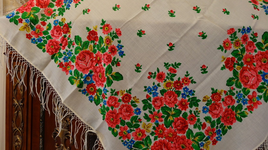 И про этот рисунок думаю, что украинский. Хотя основа цветочного мотива павловопосадская. Смущает лишь то, что у ПП в среднике при подобной раскладке была бы чёткая "шахматка"