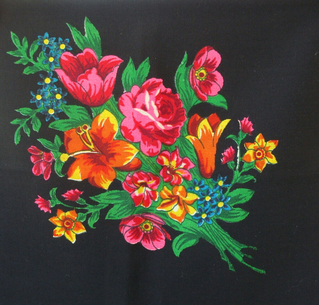 Попадаются винтажные (?) рисунки с композицией, которая отсутствует на платках производства самой ППМ. Орнамент составлен из четырёх пышных угловых автономных букетов, каждый из которых расположен на каждой четверти платка