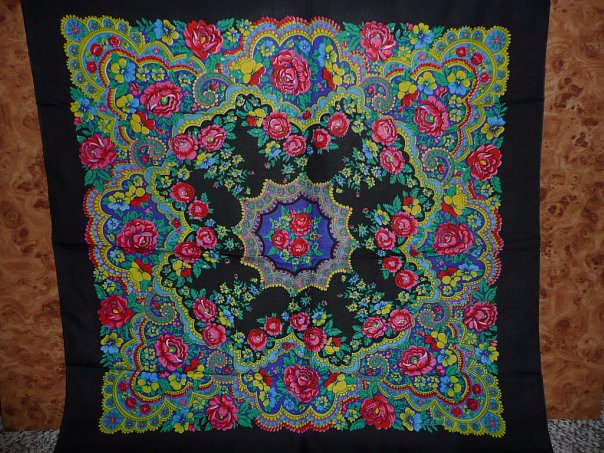 Набивные хлопковые платки (немного) делает Трехгорка (если она еще не закрылась), на их сайте где-то была фотография. Технология ротационной печати не позволяет делать раппорт больше 110 см, поэтому платки небольшие.