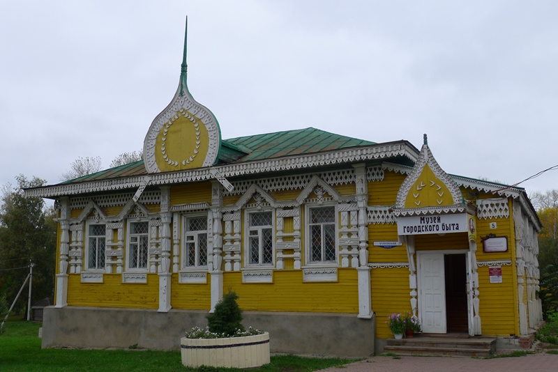Будучи в Угличе, оказались в музее городского быта XIX- начала XX в. Музейчик маленький, в нарядном кружевном домике 1897 г. когда-то была городская публичная библиотека. Теперь в нескольких комнатах собрана всякая всячина из быта провинциальных обывателей. На одном из манекенов траченное молью черное пальто, а на плече такая же видавшая виды шерстяная шаль. Какая-либо информация о платке отсутствует. На беглый взгляд, похоже на ППМ.