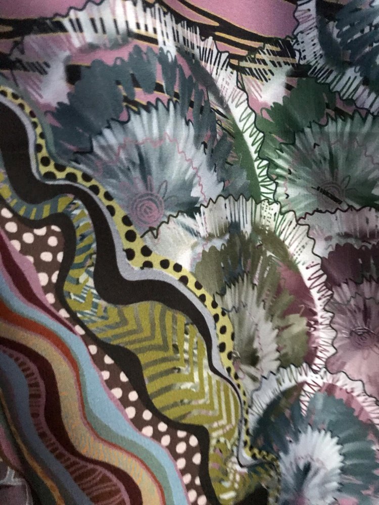 Ткань (50 %шелка и 50% полиэстера) плотная, скользкая, без блеска, но мягкая, атласная только тактильно. Визуально похожа на крепдешин.