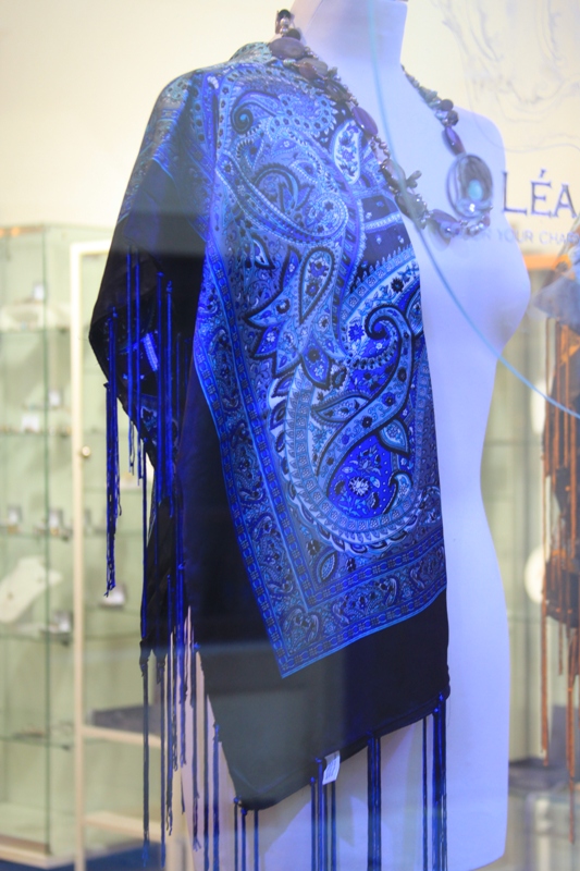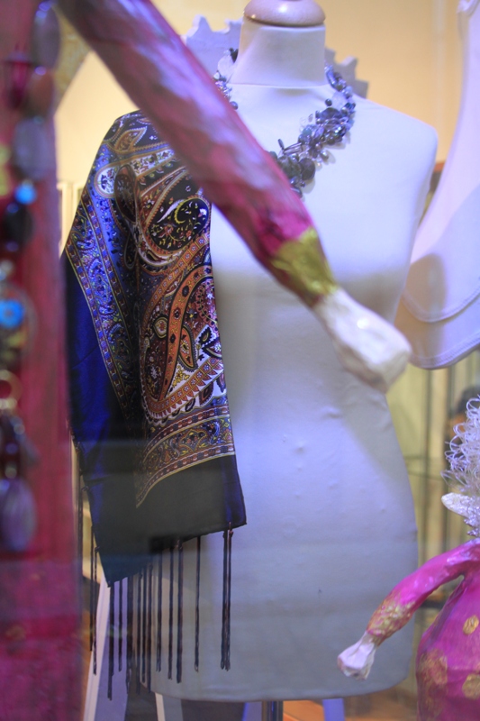 Пробегая несколько раз мимо маленького бутичка с ювелирными украшениями и бижутерией, обратила внимание на освещенные переливающиеся шелковые платки, использованные для оформления витрины. В очередной раз решила все-таки сфотографировать с улицы. Внутрь войти и рассмотреть не решилась - робею я от таких мест, где нет покупателей и даже, кажется, продавцов не видно... :)