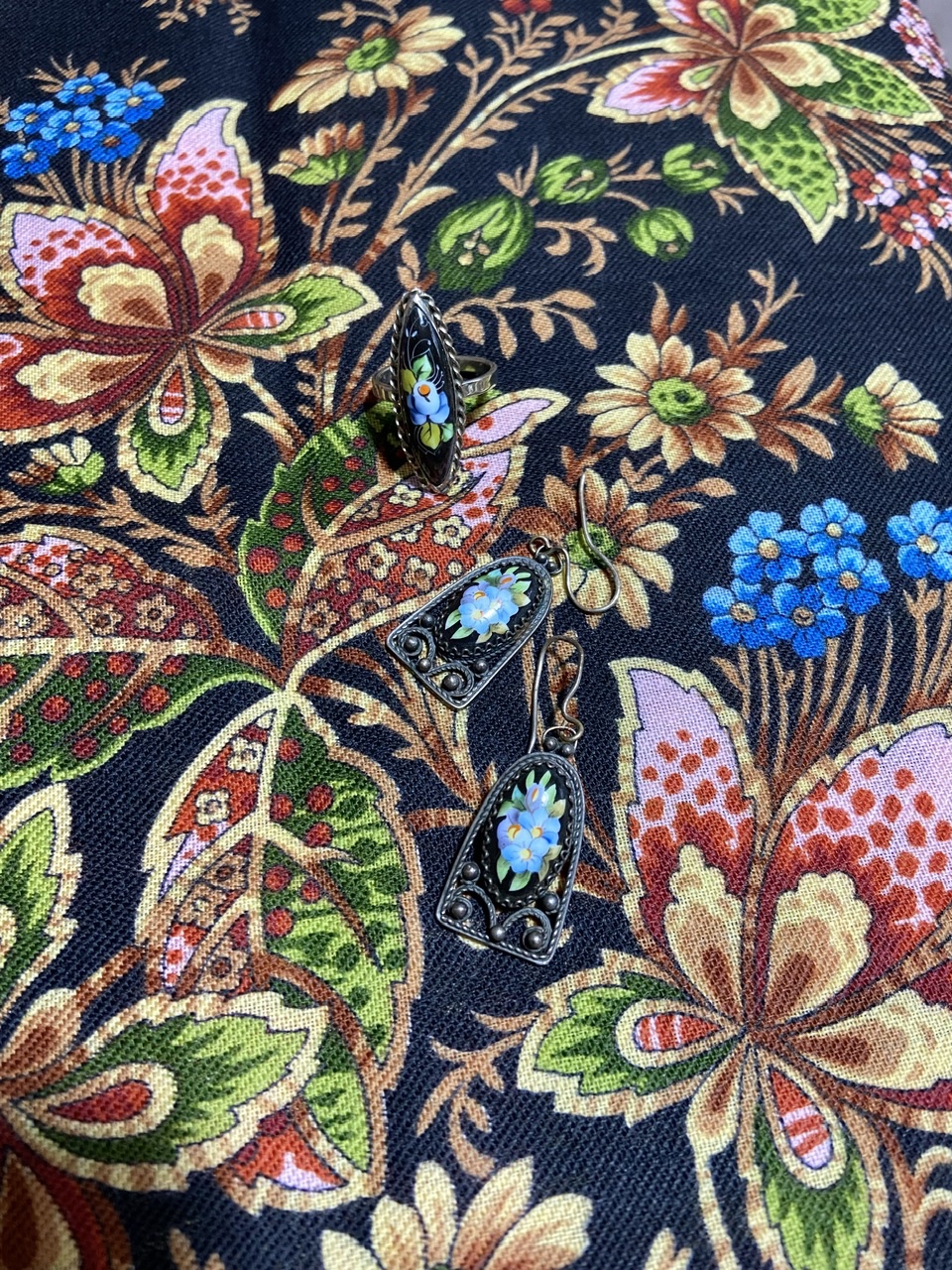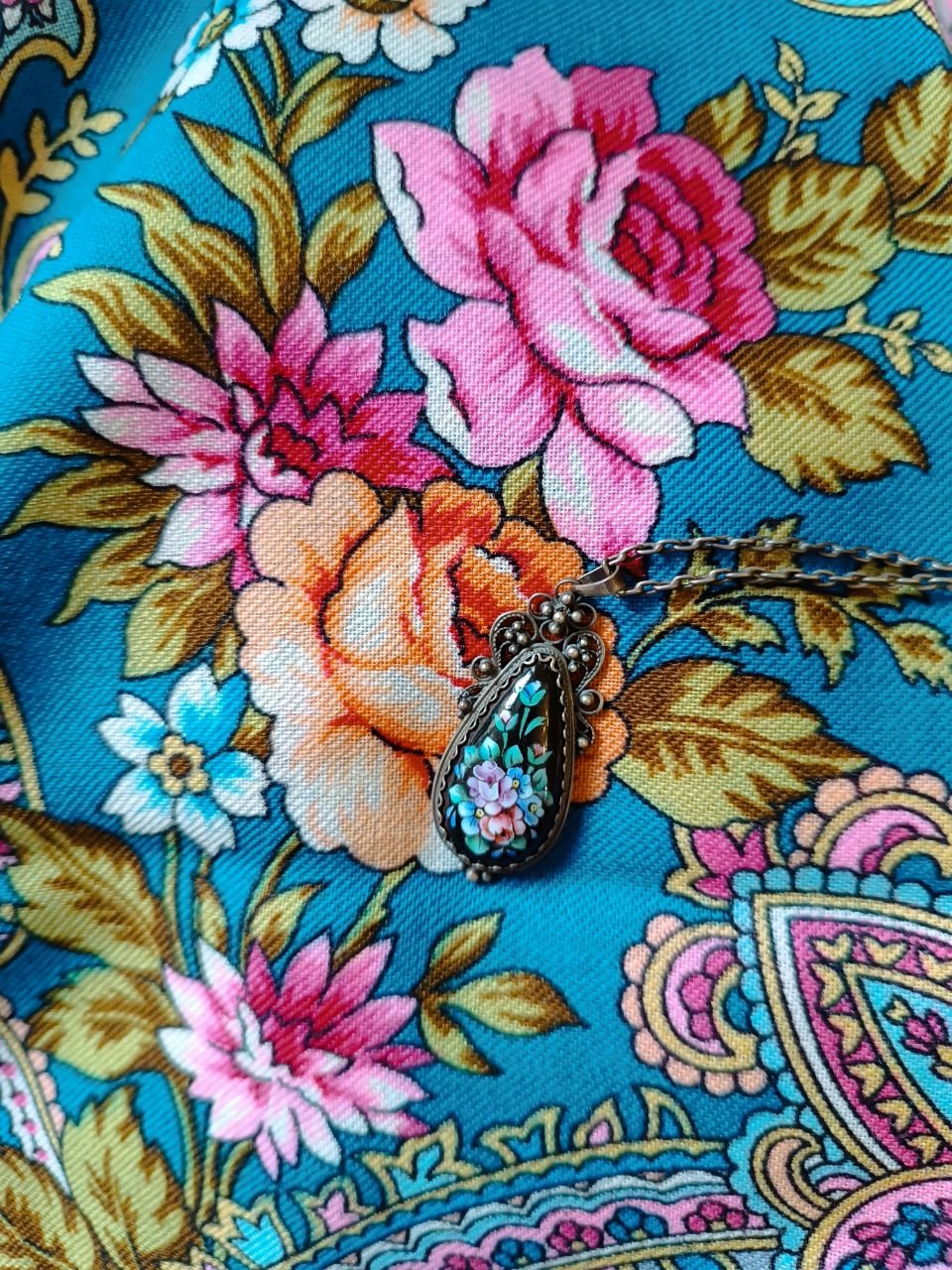 Комплект финифти с шелковыми платками. Финифть не знаю какая, но точно не ростовская.