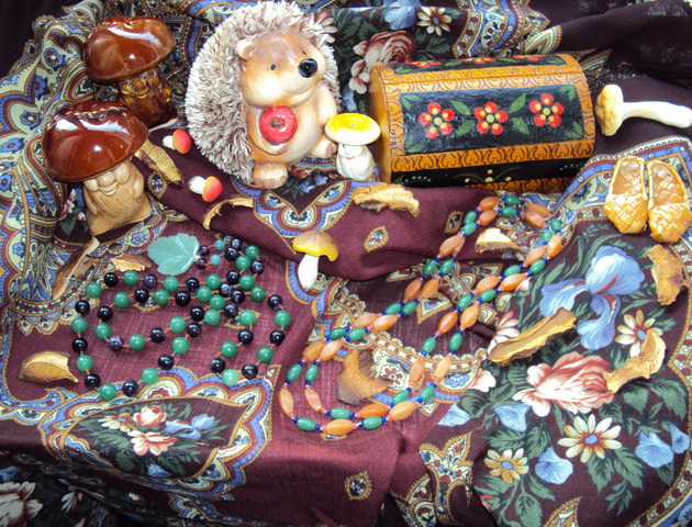 Что же касается старинного ларчика-полена, то в нём я уже много лет храню свои каменные браслетки. А также в нём умещаются ещё и "три сказочных богатыря". И хотя этот расписной ларчик открывается довольно просто, я его использую, как тест на со-о-образительность для гостей-новичков - только один, московский гость, его сразу открыл - а некоторые, в итоге, запрашивали "помощь зала"