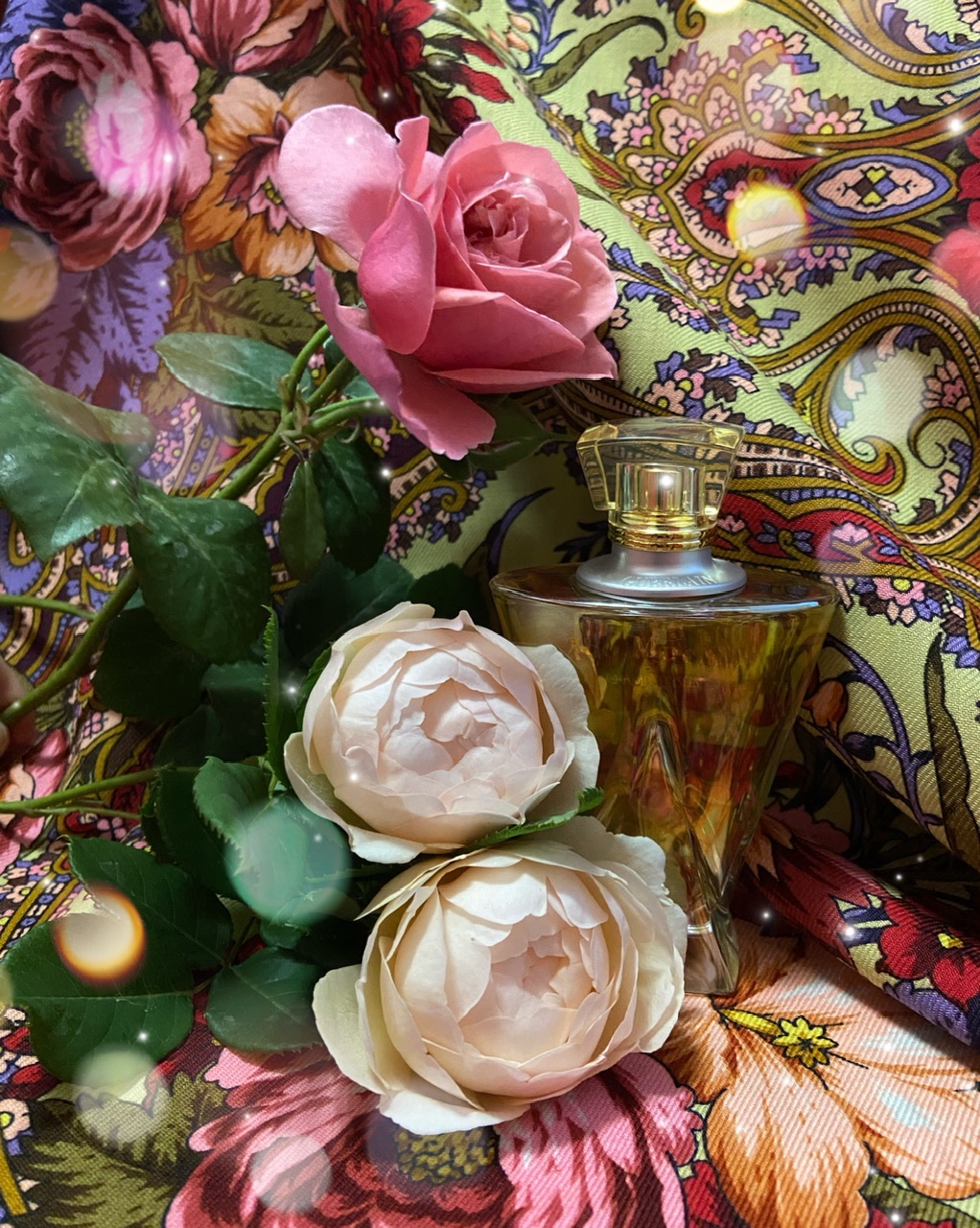 В парфюмерных ароматах не разбираюсь(Кликните, чтобы почитать, что спрятано под катом)..., но до чего же некоторые флаконы к рисункам и колоритам платков подходят