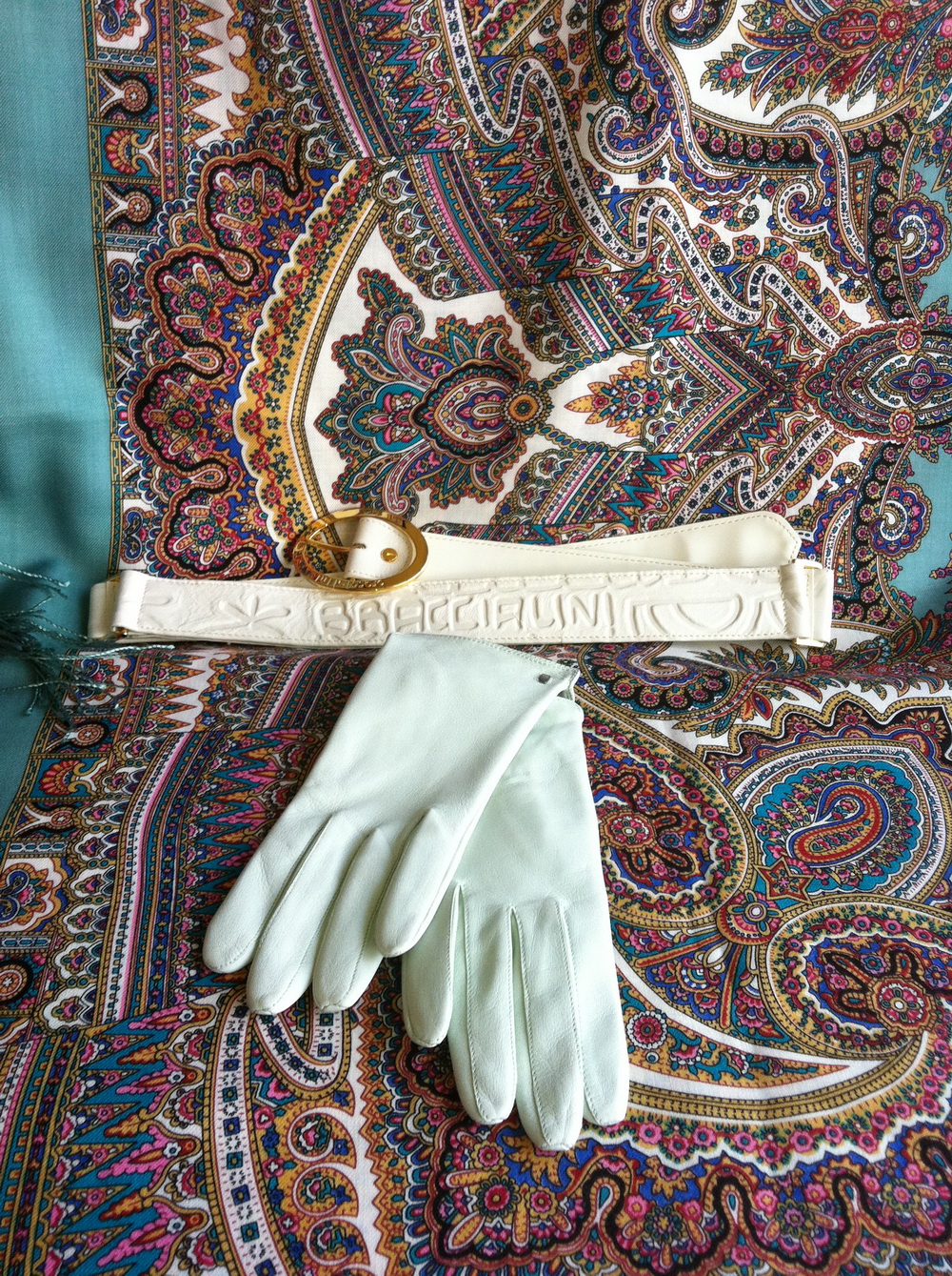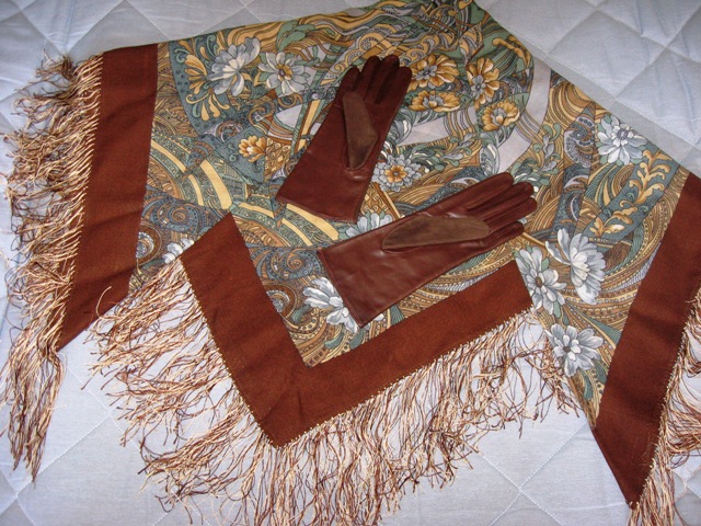 Единственный случай специальной подборки перчаток к платку в моей практике. Платок "Жемчужный берег", а перчатки комбинированные из натуральной кожи и замши (венгерские, фабрика "Альпа Главс")