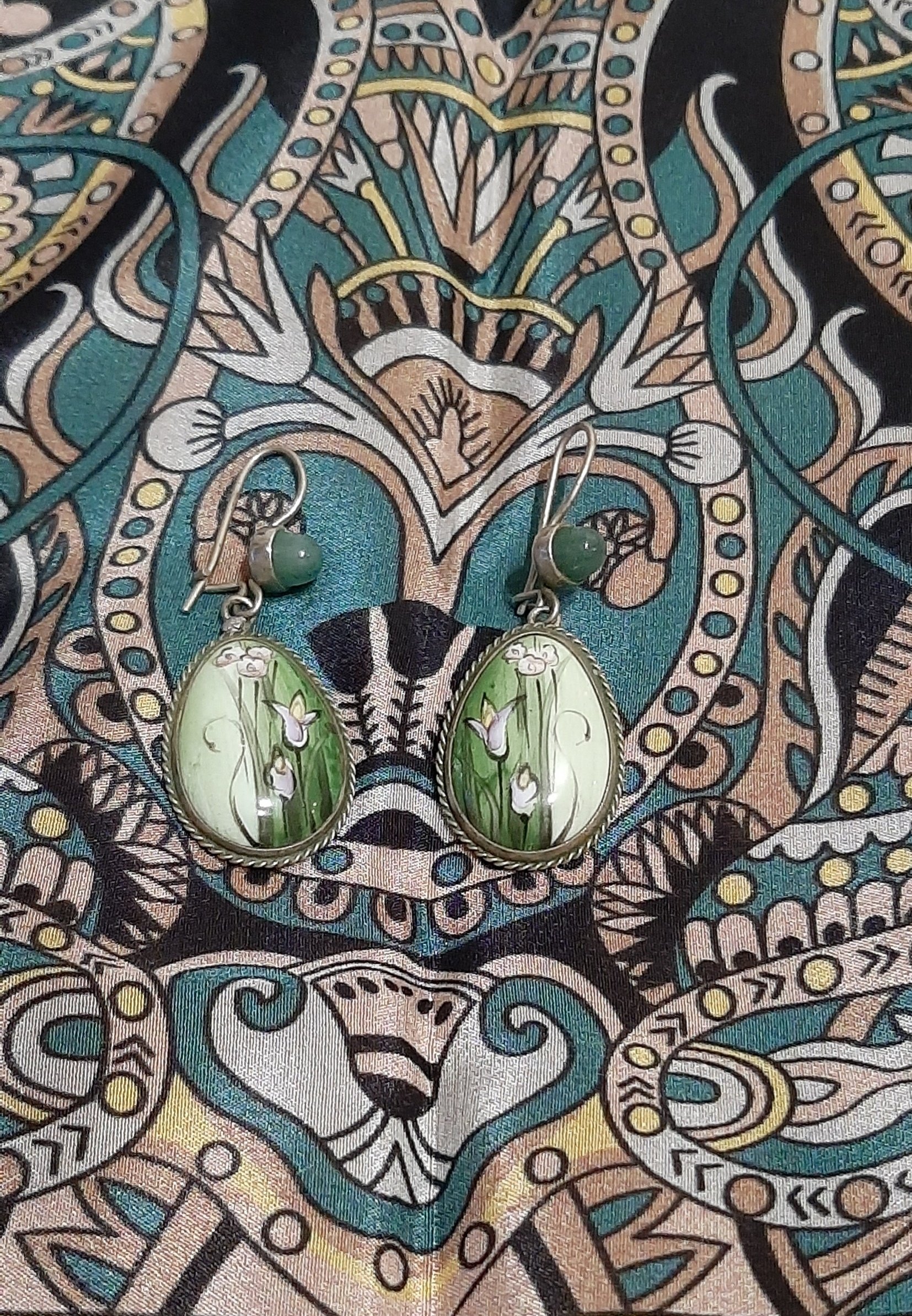 Золото Исиды и серьги с финифтью и нефритом. Цвет каймы платка такой же как половина фона рисунка сережек. Но почему-то на фото кайма у платка получается немного другого цвета.