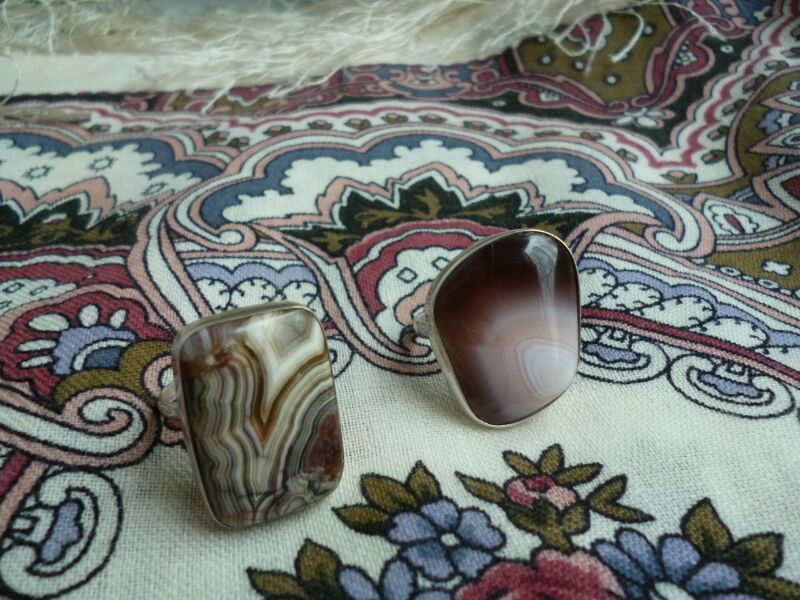 Добрый день! Честно говоря, в самоцветах понимаю очень мало, но зашла в эту тему, чтобы похвастать привезенным из отпуска - от подножия вулкана Кара-даг. Сначала два колечка с агатом. Один камень местногоп происхождения, второй - из Армении