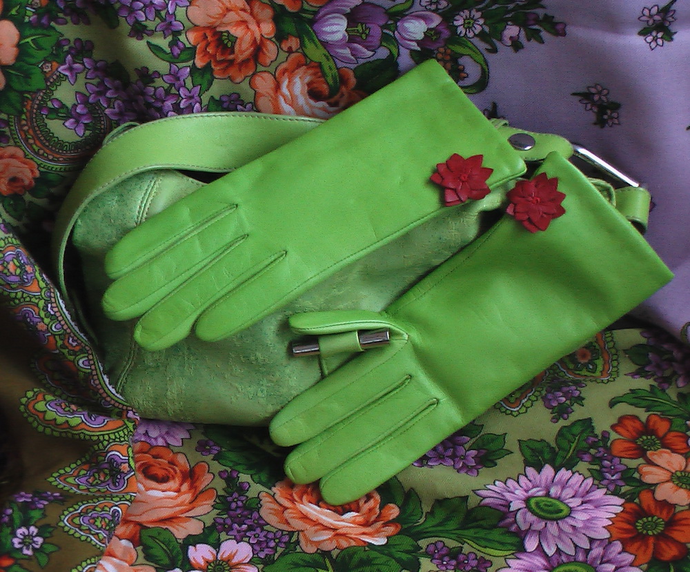Покажу свои . Я совсем не любитель зелёного, но почему то у меня собрались вот такие комплекты. Сомневаюсь : подходит ли зелёная сумка к перчаткам ( те что чёрные с зелёным на "Сиянии" лежат и "Нежности"). Конечно же было бы идеально если бы сумка была бы из зелёной замши, тем более у меня такие сапоги, но как - то скучно так и я решила купить такую сумку. Что скажите ?