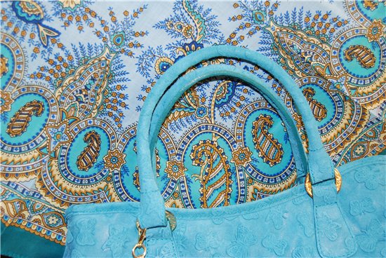 Привезли мне сумку, она оказалась совсем не большой, среднего размера в общем, цвет не самой яркой и светлой бирюзы, но фот отказывается этот цвет воспроизвести правильно, а в реале идеальное попадание под шаль ВУ1, ну, и остальные платки