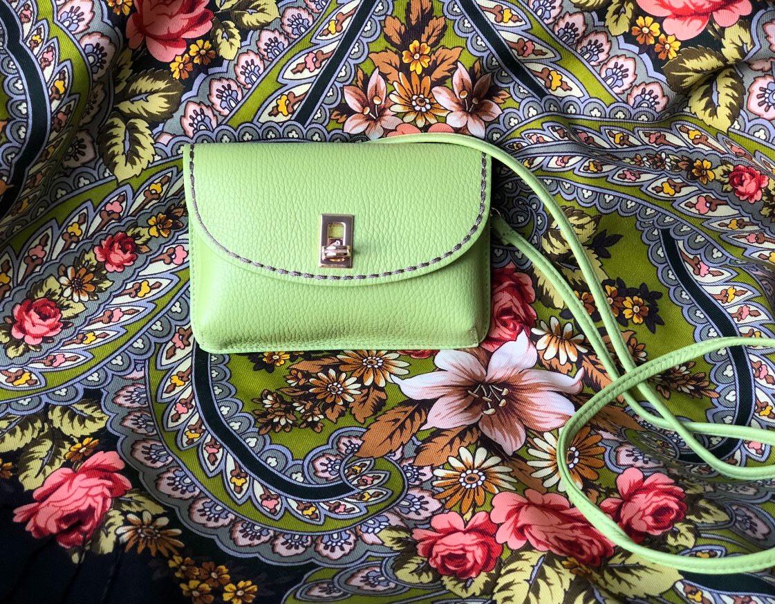 Появилась у меня вот такая очаровательная малышка , цвет называется киви. Вмещается айфон, большая ключница, карты, помада, пудреница и носовой платок. И ещё можно к ней прицепить монетницу.