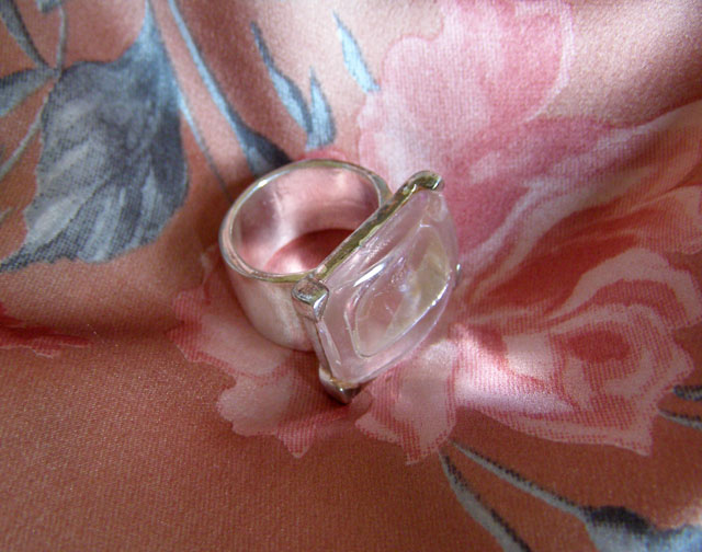 boulangerie, интересный перстень. Тяжёленький, очень стильный в кажущейся своей простоте. Жаль, не видно на фотографии "врождённой" розовости стекла, игра платочного цвета и света окрашивает в розовое даже металл. Это серебро?