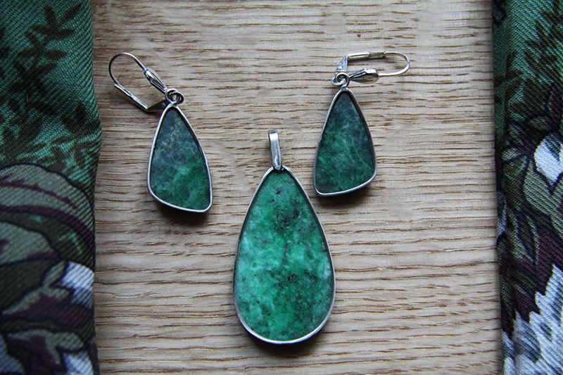 И недавно полученный комплект, кольцо забыла положить, но это уже не принципиально, лучше всего камень виден в кулоне. Месторождение Саяны, Коршуниха. Хорошо видна структура камня, только шлифовка, без вмешательства в камень.