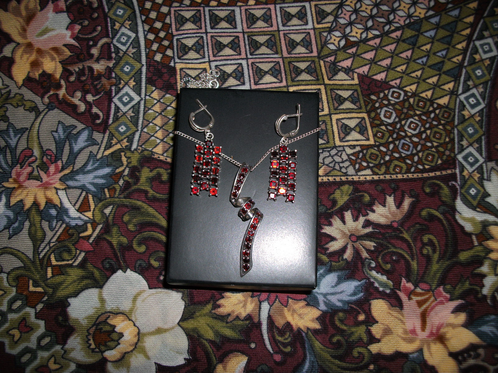 Подтверждением серьезности "шального" увлечения платками можно признать тот факт, что и другие аксессуары, такие ,например, как украшения подбираются теперь к ним. Так к вишневым "Фениксу" и новому "Романтическому" куплен гарнитур с гранатом - серьги и подвеска в серебре.