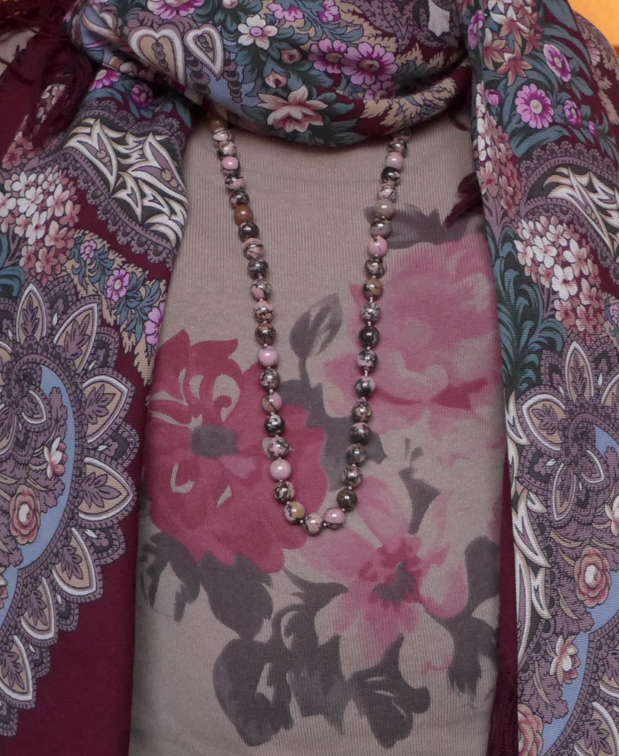 Chispa, мне кажется, это родонит, а не розовая яшма. Бусы очень подошли к платку.