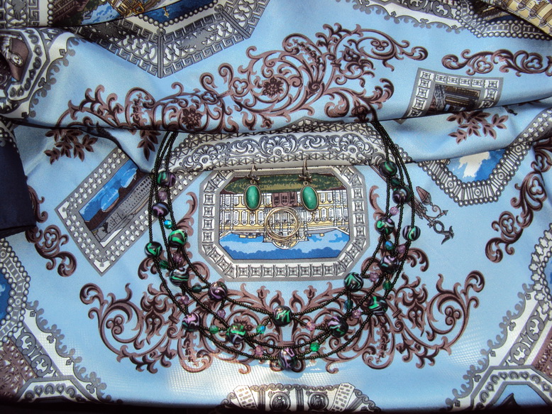 И, как исстари говорится на Руси: «раз пошла такая пьянка, режь последний огурец», - раз начала показывать платочки из серии «Города», то буду последовательна. Покажу сочетания оставшихся двух с произведениями одной замечательной мастерицы-искусницы, сейчас проживающей во Франции. Ксюша работает с полимерной глиной (последняя, если мне не изменяет память, ещё не была представлена на этих страницах, а ведь данный материал предоставляет широчайшие возможности для творческого самовыражения); и так как в плюс с прекрасными человеческими качествами Ксюшенька ещё и моя близкая подруга, то я доподлинно знаю, сколько труда, мыслей, сил, души и времени она вкладывает в авторскую разработку своих эскизов и кропотливую сборку всех вылепленных элементов и узоров задуманного комплекта, чтобы её Бижу было таковым на деле и носилось с удовольствием – что и происходит на практике