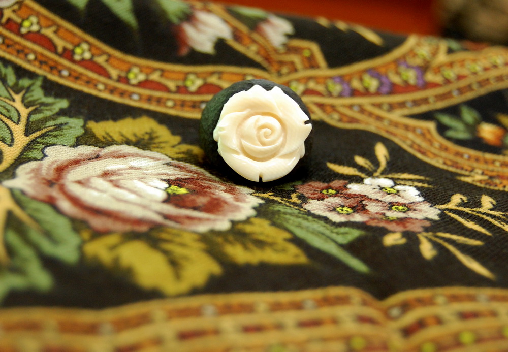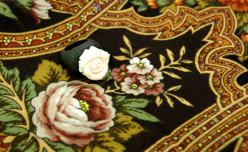 ) показать свое любимое кольцо. Сделано оно из слоновой кости (роза) и эбенового дерева. Подходит ко многим платкам, потому как роза присутствует во многих рисунках павловопосадских платков. Фотографии получились не очень качественные - не судите строго. (Наверное, нужен специальный объектив.)