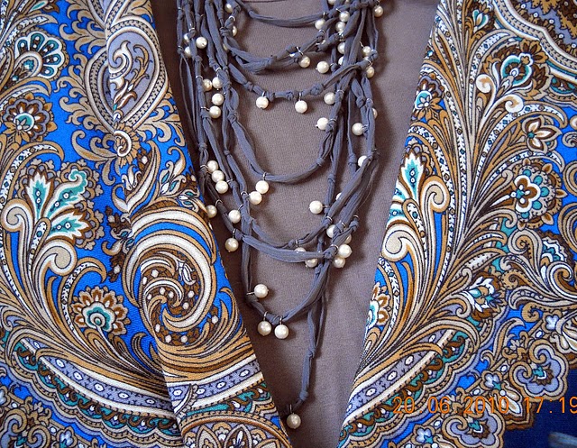 Платок хорошо сочетается с жемчугом. Думаю, что еще он будет прекрасно выглядеть с украшениями из чароита и малахита. Свой синий платок с украшениями покажу позже. (Кликните, чтобы почитать оффтопик)...