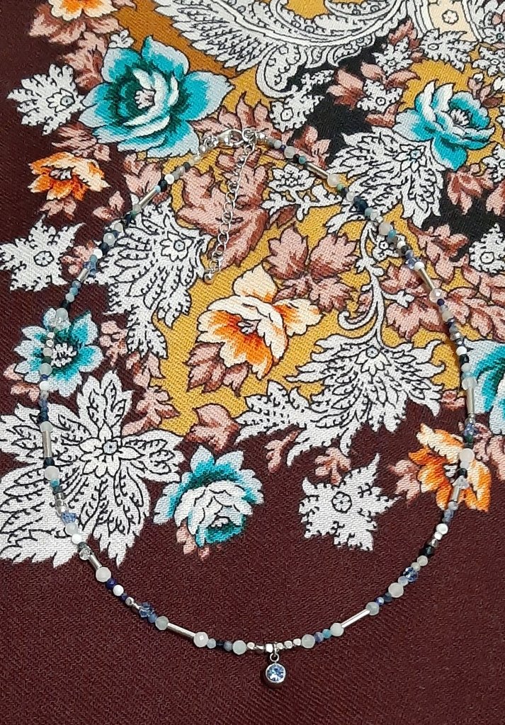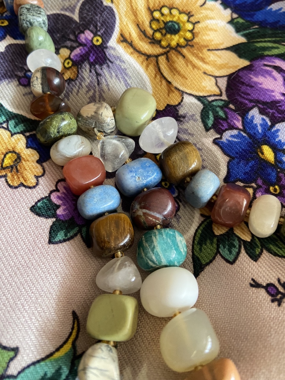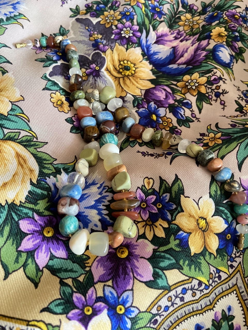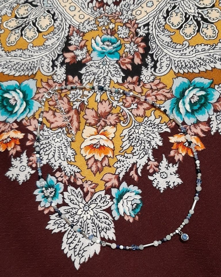 Галина, спасибо за отклик на мое сообщение. Мое недавнее приобретение. Колье из аквамарина, розового кварца, горного хрусталя и гематита. Удачное сочетание минералов, подходит практически к любому наряду и платку.