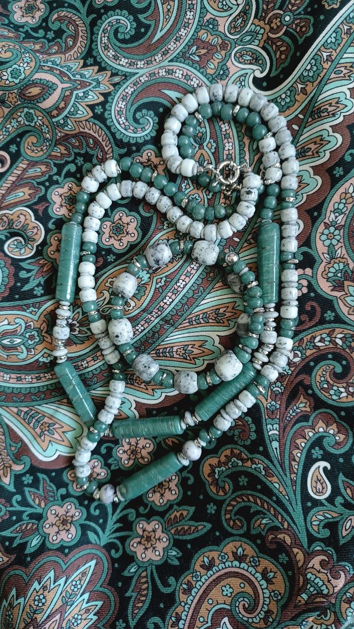 Нашла на авито странные бусины, ощущение, что стекло ручной работы, разобрала, крутила-вертела и отложила. Немного погодя попались бусы из натурального материала как раз подходящие по форме и внутреннему диаметру, из самых крупных камешков собрала браслет. Совпали с шалью идеально.