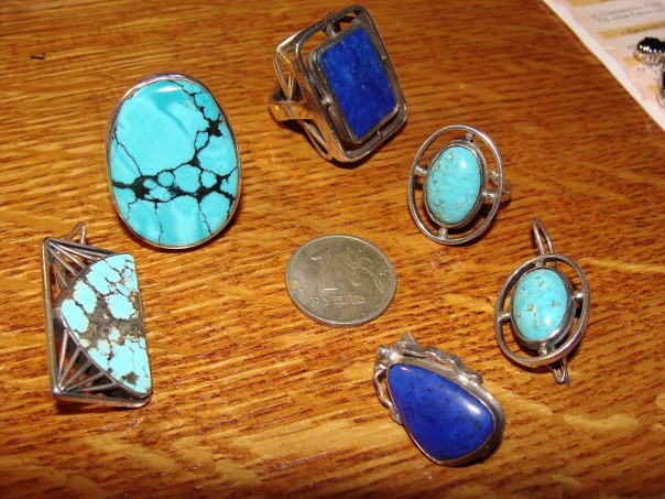 Eva, все мои украшения с камнями можно назвать дизайнерской работой. Всё покупалось на выставке "Мир камня" в разное время. К сожалению, могу назвать ювелира только лазуритового кольца. Его зовут Юрий Дробаха. Но это одно из его простейших изделий. Вот фото с рублём для масштаба.
