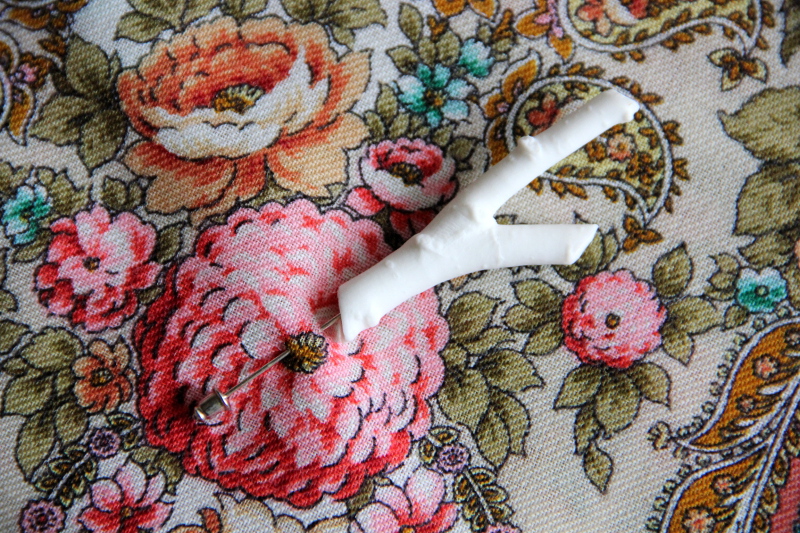 Люба, веточка интересная очень. Я опытным путем пришла к тому, что шляпная булавка - самое удобное крепление для платков. Длины иглы хватает, чтобы ткань не портилась и не сминалась излишне, не образовывались дыры. Обычной брошкой большие объемы трудно закалывать.