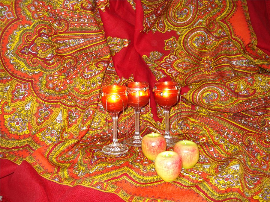 Девочки, спасибо всем за отзывы ^% , Елена-Ч ^a , кайма на Русском узоре действительно алая, чуть-чуть с апельсином, её сравнивали с пионерским галстуком. Она похожа на ало-оранжевые вставки по кайме на Турецком, я их тут вместе расположила, где четыре платка. А вот середина на Узоре темно-красная, видно где с Птицей рядом, и кайма у них разная, это для сравнения.