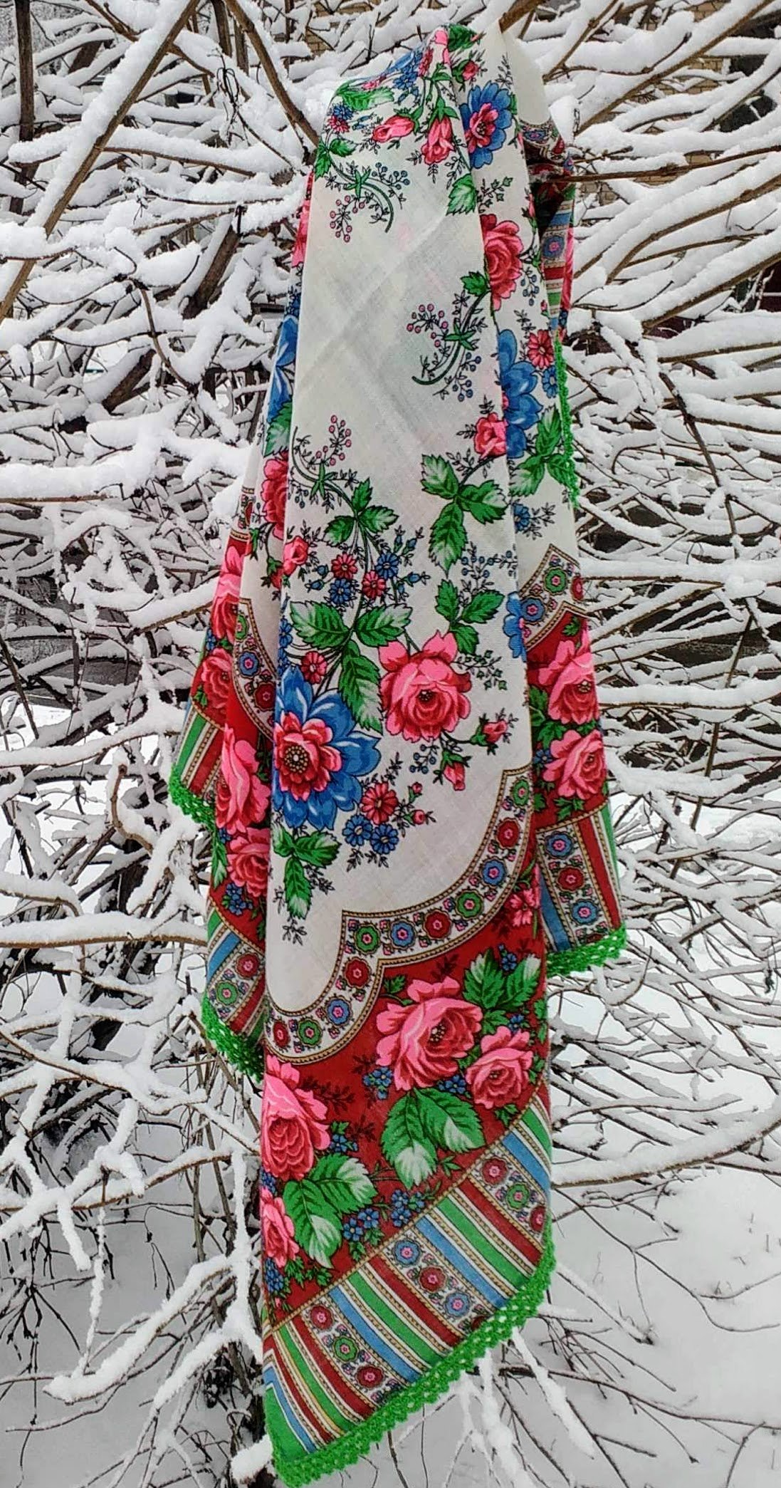 Добавлю чудесный только что купленный платочек Золотой невод 2 Е.Фаворитовой 110см, шерсть. Графика и нежные цветочки на белом фоне.