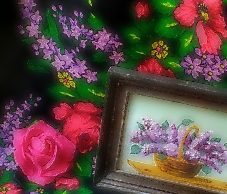 Кажется, поняла, в чем дело - в свечении. Цветы на жостовских подносах всегда светятся, и этот же эффект присутствует в Ладоге.