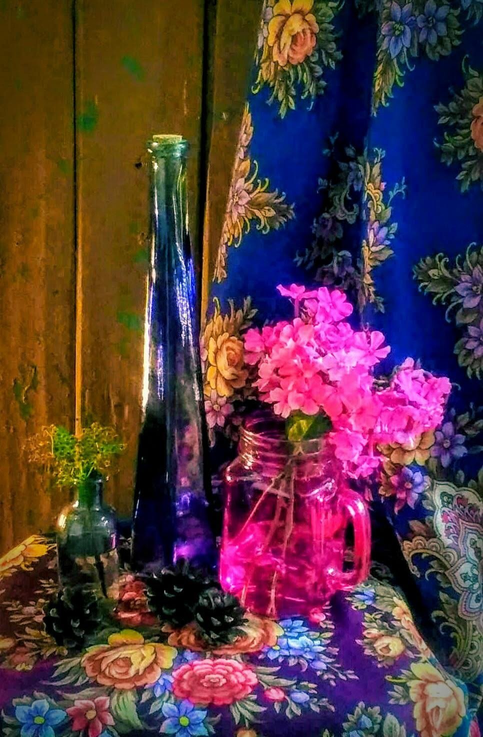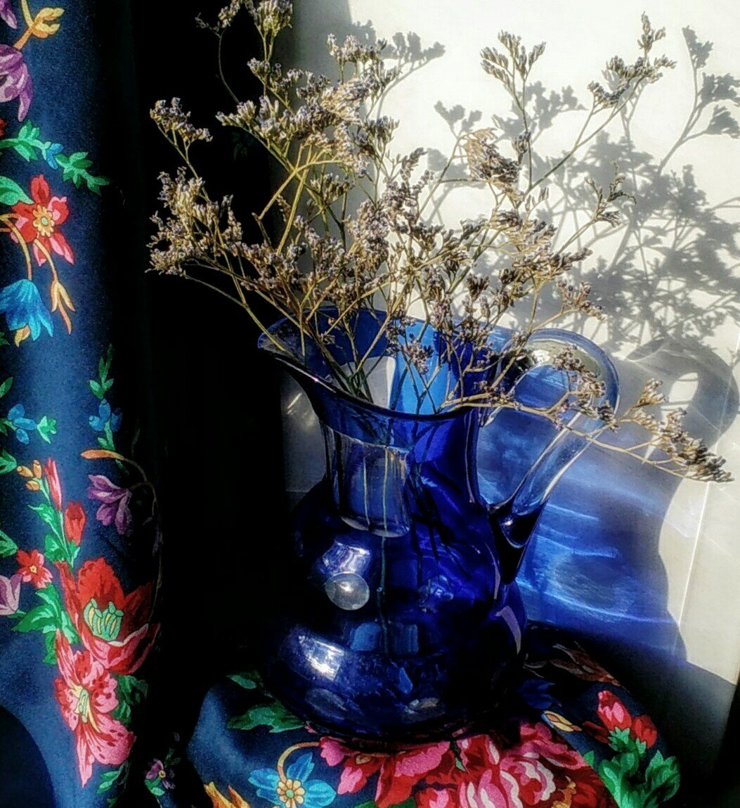 Добавлю летнее фото тоже с ярким синим, платок Услада 14, 125см Ю.Уткина, стекло и флоксы...