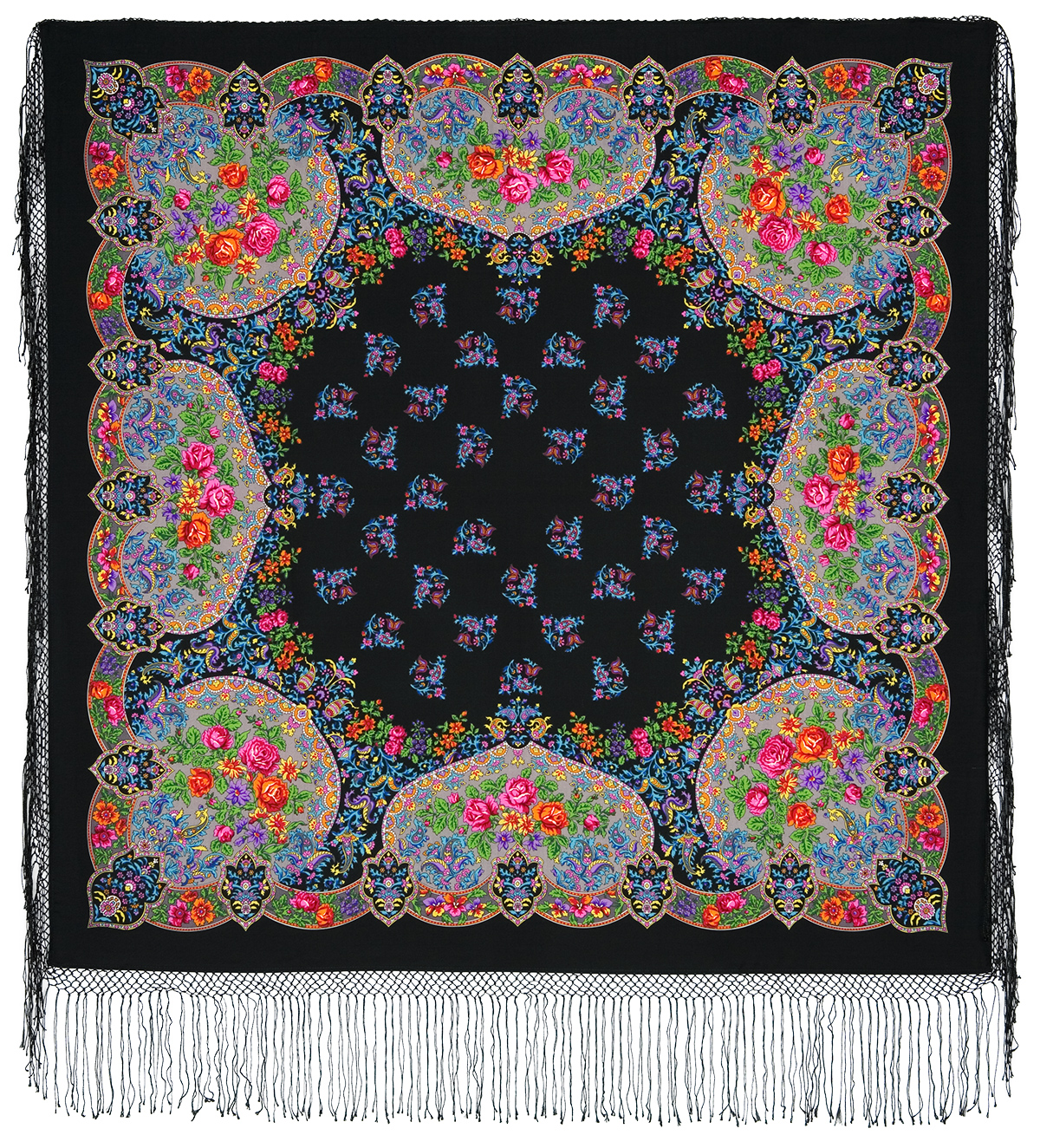 По краю платка разбросаны розетки в виде гребешков волн с разными букетиками цветов в каждом: